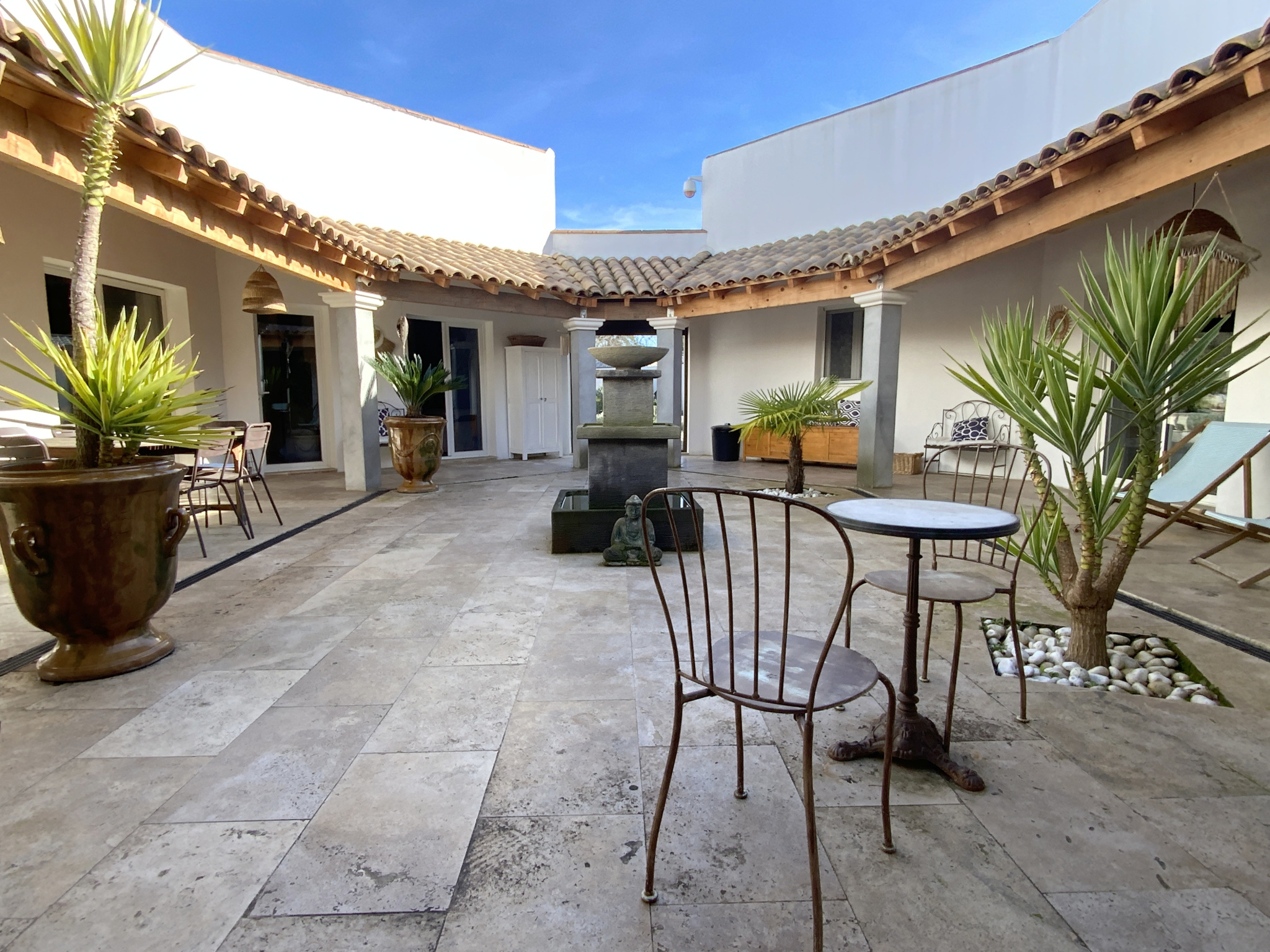 - Située dans un village disposant de commerces, à seulement 10 minutes d’Uzès, l’agence Sindy Micots Immobilier Uzès vous propose cette villa atypique de plain-pied d’une superficie de 168 m², organisée autour d’un patio central. Entièrement rénovée en 2023, cette propriété offre de beaux volumes, ainsi qu'une belle hauteur sous plafond. Vous découvrirez un espace de vie d’environ 70 m² comprenant une cuisine équipée avec îlot dinatoire, ouverte sur un salon et une salle à manger. Un second salon, agrémenté d’un poêle complète l’ensemble. La villa dispose également de quatre chambres dont une avec dressing. Implantée sur un terrain entièrement paysagé de 2 255 m², la propriété accueille une piscine tout aussi atypique, sublimée par une élégante plage en bois, créant un véritable espace dédié à la détente et à la convivialité. Une dépendance atenante et un terrain de pétanque. Un lieu calme et paisible, sans aucun vis à vis. Une belle rénovation avec des materiaux de qualité et un état irréprochable.
