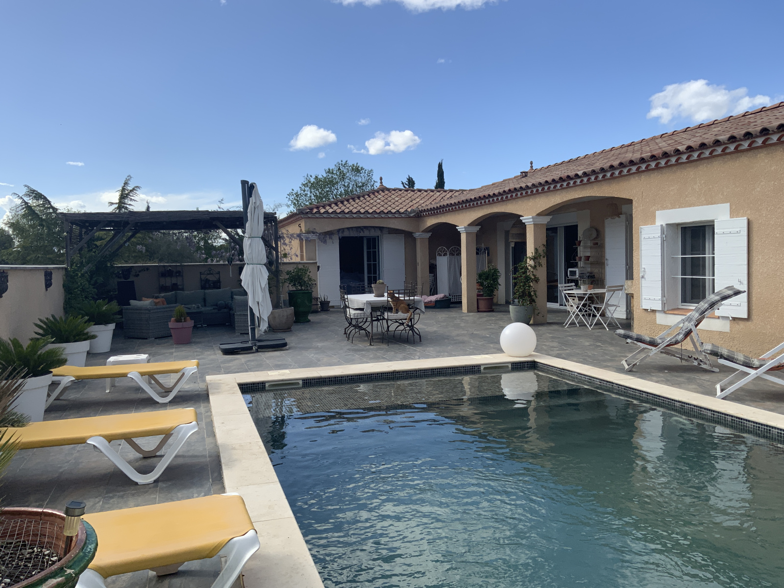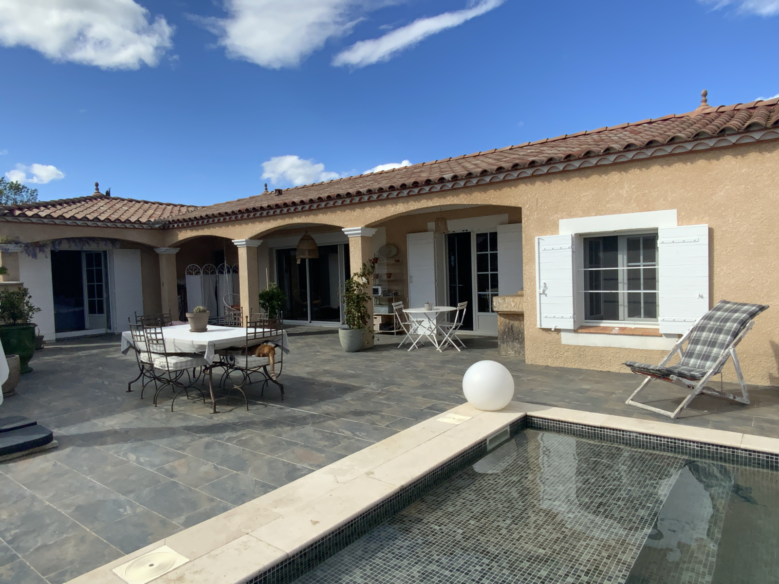 L'agence Sindy Micots Immobilier Uzès vous propose dans un village à quelques minutes d'Uzès, une charmante villa de plain pied au calme sur un terrain clos et arboré avec une belle piscine chauffée. Cette maison offre un spacieux séjour lumineux ouvert sur une large terrasse sans vis à vis avec piscine chauffée. Cuisine équipée. 5 chambres, 4 salles d'eau. Portail automatique, grand parking, abri pour voitures, double vitrage. Pompe à chaleur. Maison très fonctionnelle.